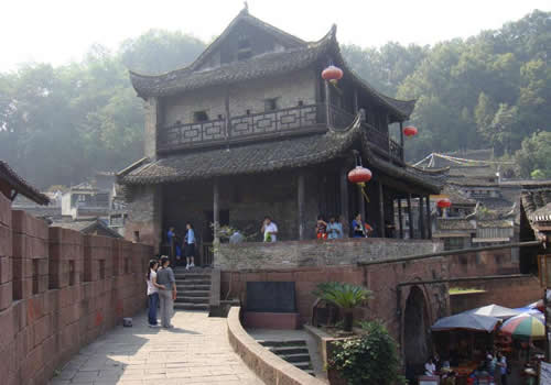 東門城樓位于城東,緊靠沱江,原名"升恒門",為鳳凰古城四大城門之一。 東門城樓始建于清康熙五十四年(1715年),城門下部由紫紅砂巖砌成,上部城樓則用古磚砌筑。城門寬3.5米,高4米,呈半圓拱,兩扇城門都用鐵皮包裹,用圓頭鐵釘密釘,牢實堅固。城墻修筑全部用紅砂條石,精工細鉆,規(guī)格一致,城墻厚0.8米,下部內(nèi)外兩側用條石加石灰漿砌成,中間填以碎石粘土,層層夯實;頂部的中間填充物改為石灰、鵝卵石、黃土拌成的三合土,厚約0.33米,上面鋪以紅砂塊石。城樓高11米,大門上方有槍眼8孔。歇山屋頂,覆以腰檐,飛檐翹角,精美壯觀。