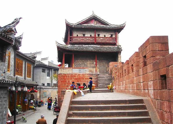 到清朝,古城的軍事地位日顯重要,先后在這里設(shè)鳳凰廳、鎮(zhèn)竿鎮(zhèn)辰沅永靖兵備道治所,古城的建設(shè)也得到加強?滴跷迨哪辏1715年)遂將磚城改建為石城,北門定名為“壁輝門”,一直保存至今。北門古城樓采用本地紅砂條石筑砌,做工考究,精鉆細琢。城門呈一半月拱,有兩扇鐵皮包裹。圓頭大鐵釘密鉚其上的大門。城樓用青磚砌筑,重檐歇山頂,穿斗式木結(jié)構(gòu),石座卷頂。城樓對外一面開槍眼兩層,每層4個,能控制防御城門外一百八十度平面的范圍。北門城樓與東門城樓之間城墻相連,前臨清澈的沱江,既有軍事防御作用,又有城市防洪功能,形成古城一道堅固的屏障,雖幾經(jīng)戰(zhàn)火,仍巍峨聳立于沱江河岸。