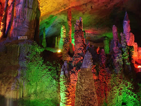 | 九天洞位于湖南張家界市桑植縣城17公里的利福塔鄉(xiāng),距市區(qū)70公里,距武陵源62公里,因洞內(nèi)有九個(gè)自然天窗九天洞而得名,總面積250公頃,是中國目前發(fā)現(xiàn)的溶洞之最,比號稱世界第一的利川溶洞大三倍。九天洞內(nèi)空氣清新,冬暖夏凉。整座洞穴分上、中、下三層,有五層不同高度的螺旋式觀景臺,最下層低于地表面400多米。經(jīng)初步探明洞內(nèi)有40個(gè)大廳、3條落差懸殊的陰河、12條瀑布、5座自生橋、10余座洞中山,此外,還有不可勝數(shù)的五光十色的鐘乳石群。在眾多迷人的景觀中尤以九星山、玉宮、水晶宮、九天玄女宮、壽星宮五大奇觀最為著名。