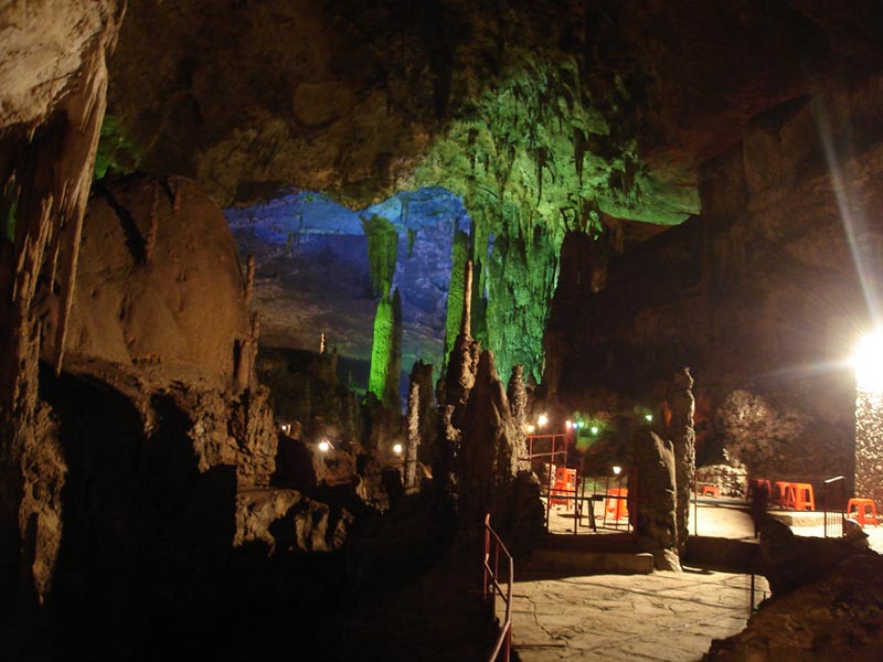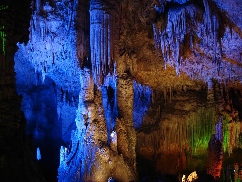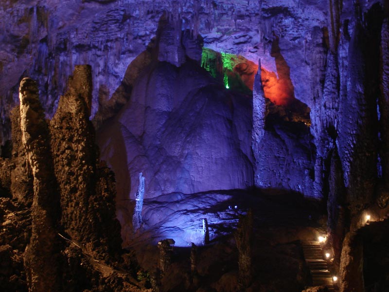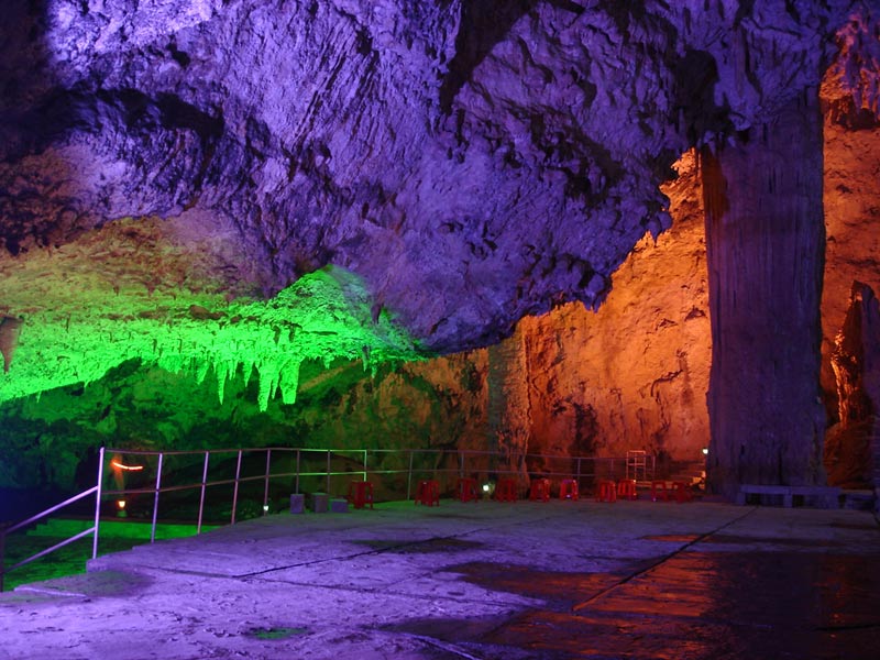 九天洞圖片 九天洞四絕: 第一絕:九天洞大 九天洞總面積250多萬平方米,折合4萬多畝。這樣一個(gè)大溶洞,比堪稱世界第一洞的利川溶洞還大3倍。據(jù)《環(huán)球天然奇觀》一書介紹,南斯拉夫的波斯托伊納大巖洞與美國的巴哈馬大藍(lán)洞,都稱為“世界上最大的洞”,還有古巴的貝拉雅馬爾大巖洞與我國貴州、湖北神農(nóng)架一些溶洞,也都被稱為“世界或中國最大的溶洞”。可是這些溶洞,同九天洞比較,都會(huì)感到遜色不少。1988年,中國科學(xué)地質(zhì)研究所巖溶與地下水研究室主任張壽越教授兩次來九天洞考察,他認(rèn)為該洞是亞洲第一大洞,于是他給九天洞題詞:“滴石鑄玄女,暗河鏤九天”。1988年9月下旬,來自美國、英國與比利時(shí)的15位洞穴專家對九天洞作深入研究,連續(xù)7天7夜住在洞內(nèi)全面考察。通過考察,他們一致認(rèn)為九天洞是世界奇跡,不僅具有很高的旅游價(jià)值,同時(shí)還有很高的科研價(jià)值。