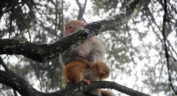 面對(duì)白雪紛飛的天氣,景區(qū)游道上原來(lái)常見的猴群突然不見了蹤影,這些可愛的獼猴去哪兒了?筆者在黃石寨景區(qū)經(jīng)過(guò)一番探究發(fā)現(xiàn),獼猴去處大致有三:一是在山峰懸崖石臺(tái)處避風(fēng)雪;二是在大樹樹枝上躲風(fēng)雪;三是在游道旁的雜草中找溫暖。那么,這些獼猴靠什么維持生存呢?主要是靠吃樹葉,另外到訪游人攜帶的食品常常成為獼猴爭(zhēng)奪的“獵物”。