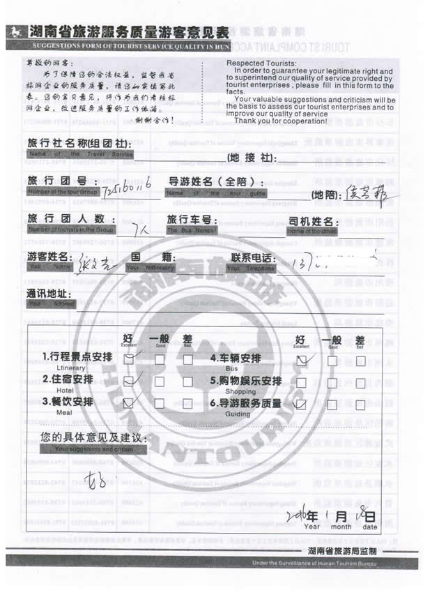 1月份,長沙張女士一行7位貴賓與湖南西部(張家界)中國國際旅行社工作人員——張群取得聯(lián)系,經(jīng)過商談,雙方達(dá)成協(xié)議并簽訂旅游合同,于1月16日抵達(dá)張家界,開始張家界之旅。此次行程是由我社優(yōu)秀導(dǎo)游——侯芳菲負(fù)責(zé)旅游接待工作,侯在旅游過程中講解詳細(xì),客人也很滿意。同時也感謝張女士一行貴賓選擇湖南西部(張家界)中國國際旅行社,以及您對湖南西部國旅的信任與支持。我們會繼續(xù)努力,做好旅游接待工作。期待下一次與您的合作,祝您愉快!