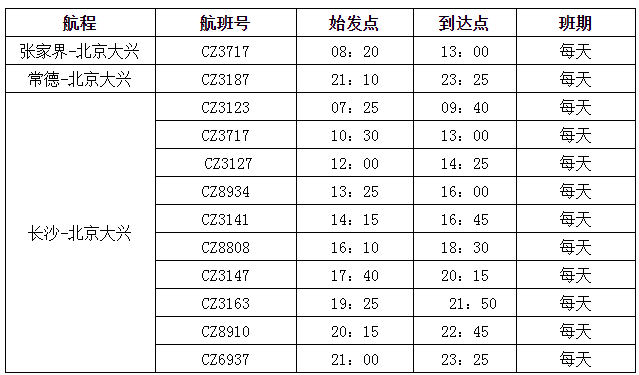 南航冬春換季后還全面優(yōu)化了各地往返北京大興的航線網(wǎng)絡。其中,張家界至北京大興航班為每天一班的朝發(fā)夕歸航班,去程CZ3717(張家界-大興)航班08:20張家界出港,回程CZ3164(大興-張家界)航班17:50北京大興起飛,時刻非常方便出行,張家界始發(fā)至大興單程僅450元起(不含稅)。常德每天往返北京大興1班;長沙每天往返大興10班(2班為寬體機),均提供“精品航線”服務。此外,北京大興往返廣州、深圳、上海、長沙、貴陽、珠海、海口、三亞、哈爾濱、大連、杭州、重慶、西安、烏魯木齊等全國主要城市均為早中晚全天候航班布局,方便旅客航空出行和中轉(zhuǎn)銜接。