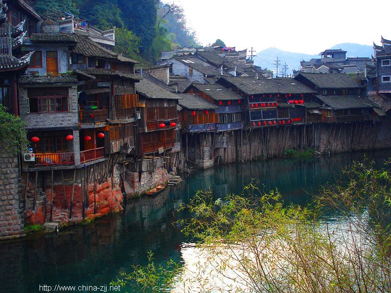【鳳凰古城位于沱江之畔、群山環(huán)抱、關(guān)隘雄奇、碧綠的沱江依著城墻緩緩流淌,疊翠的南華山麓倒映江中,江中漁舟游船數(shù)點(diǎn),山間暮鼓晨鐘兼鳴,懸崖上的吊腳樓輕煙裊裊,碼頭邊的浣紗姑笑聲朗朗,兩岸已有數(shù)百年歷史的吊腳樓更是別有一番風(fēng)味;順?biāo)麓┻^虹橋一幅江南水鄉(xiāng)的畫面便展現(xiàn)于眼前--萬壽宮、萬名塔、奪翠樓……一種遠(yuǎn)離塵世的感覺悠然而生;鳳凰--猶如“一幅濃墨淺彩的中國(guó)山水畫”】